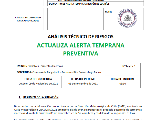 ONEMI Los Ríos Declara Alerta Temprana Preventiva Comunas de Panguipulli – Futrono – Rios Bueno – Lago Ranco por Probables Tormentas Eléctricas