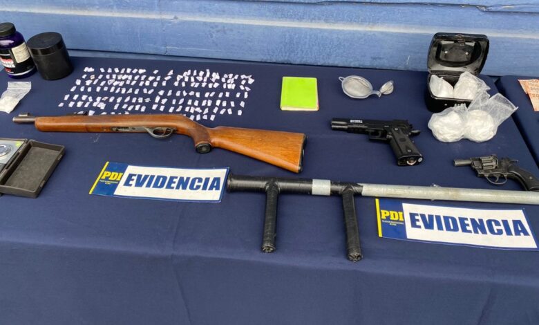 En cuanto al total de droga incautada por los Detectives, esta correspondió a 1.873,69 grs. de cannabis sativa, 637,62 gramos de Clorhidrato de Cocaína, 24,09 gramos de Cocaína Base con 165 envoltorios de nylon transparente, 2 plantas de cannabis sativa, 2 frascos de creatina, celulares, balanzas digitales, 3 vehículos y 1 millón doscientos mil pesos en dinero efectivo aproximadamente. Además, se incautaron 1 rifle calibre 22 largo, 1 revolver a fogueo calibre 22, 1 pistola de are comprimido, 1 escopeta de fabricación artesanal, 86 proyectiles balísticos calibre 22 y medio centenar de cartuchos calibre 16 entre otros.