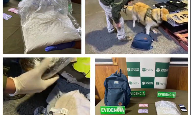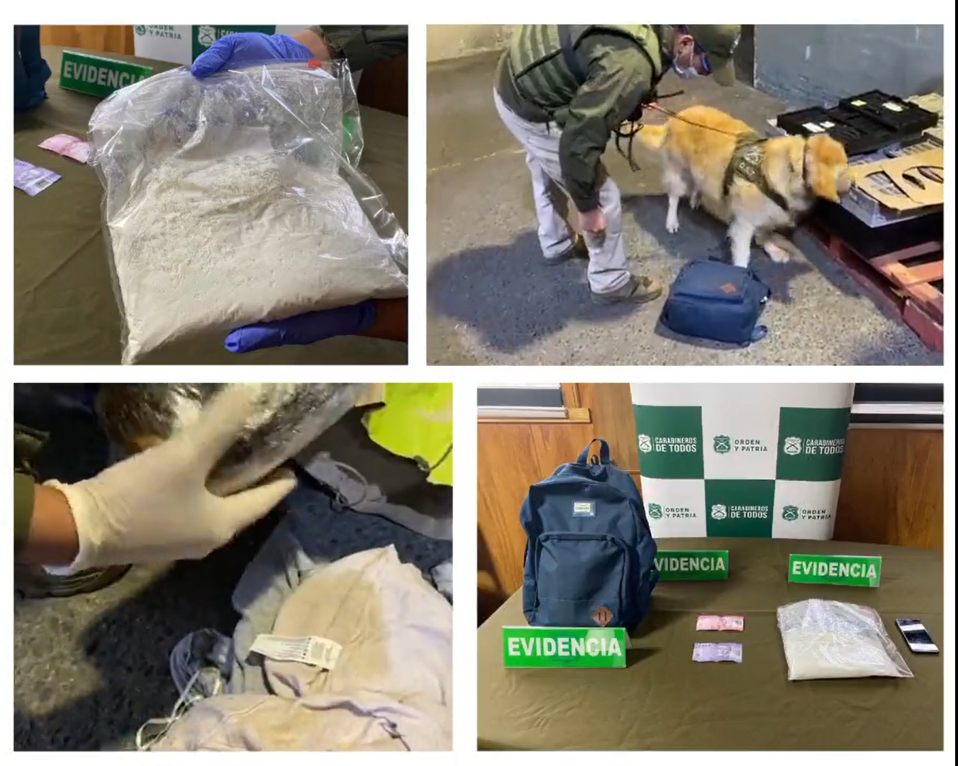 Valdivia: Según investigación liderada por la Fiscalía local, Carabineros del OS7 decomisó 1 kilo 4 gramos de pasta base de cocaína desde el equipaje de un pasajero proveniente de Talca, el cual era investigado por comercializar sustancias ilícitas en la capital regional.
