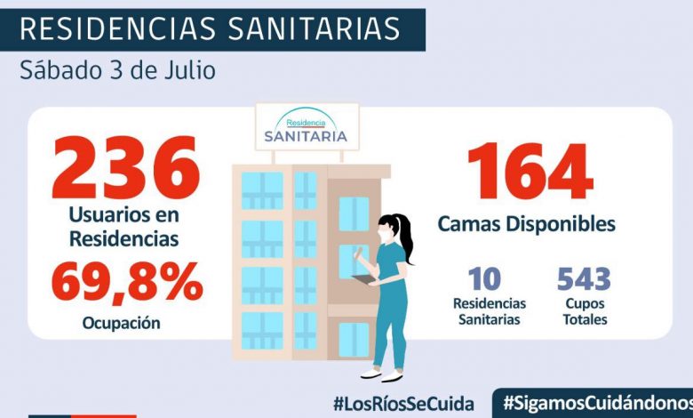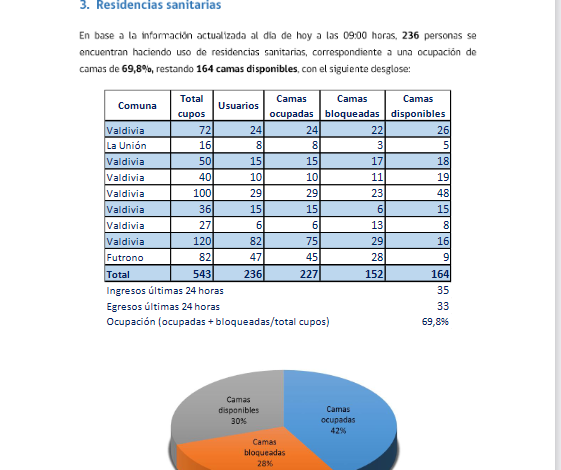 Respecto a las Residencias Sanitarias, a la fecha, 236 personas están haciendo uso de estos espacios de aislamiento, lo que representa un porcentaje de 69,8% de camas ocupadas. Al día de hoy, quedan 164 camas disponibles en estos espacios de aislamiento.