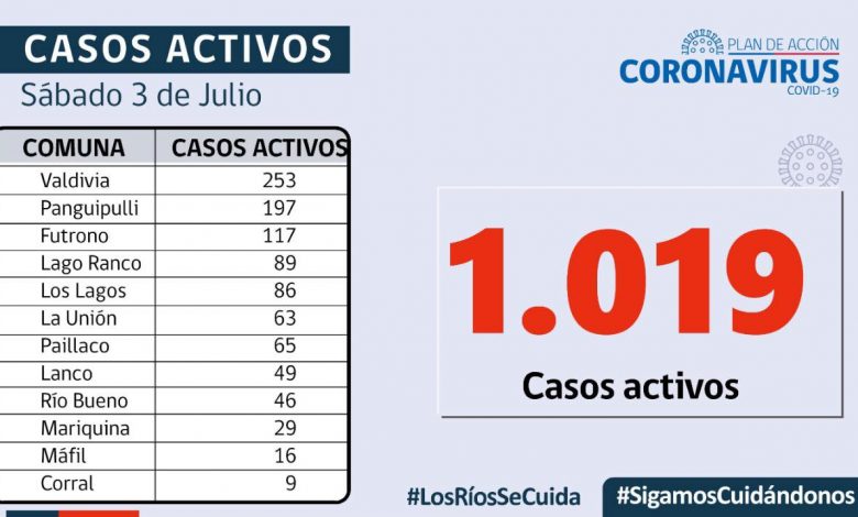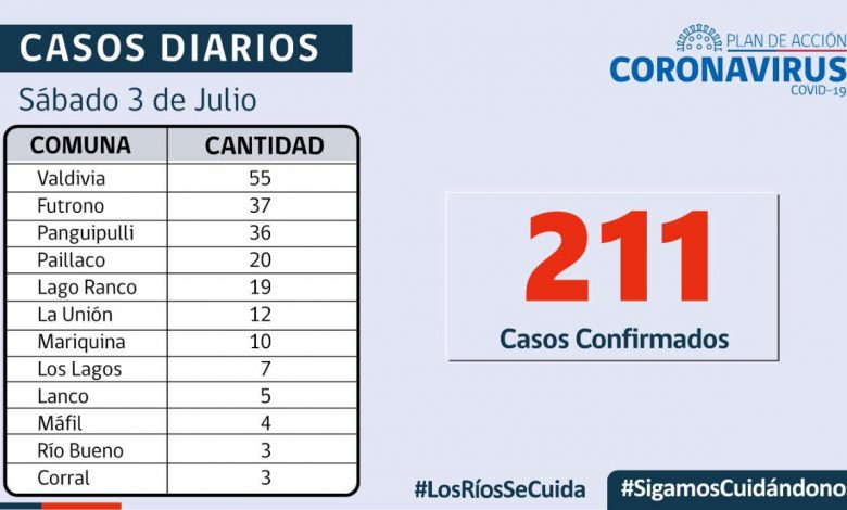 De los 211 casos confirmados por residencia en Los Ríos, 164 corresponden a casos secundarios, 33 aún están sin trazabilidad y 14 se encuentran en investigación. En tanto, a la fecha, la región presenta 46.085 casos acumulados, de los cuales 1.019 corresponden a casos activos, 44.550 a personas recuperadas y 516 a fallecidos.