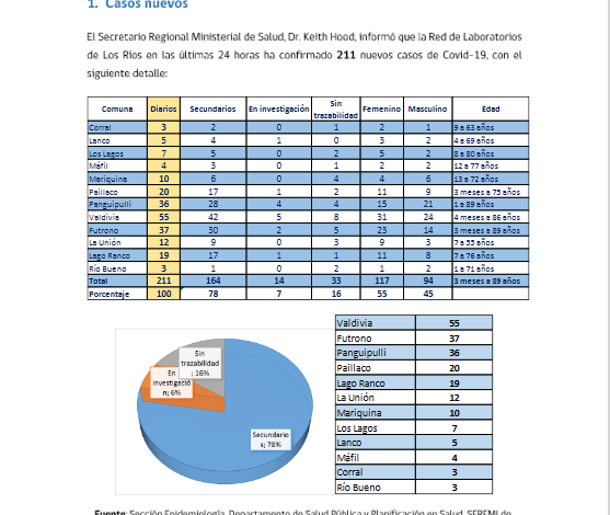 REPORTE] El SEREMI de Salud, Keith Hood, informó que hoy se reportaron 211 nuevos casos de COVID-19 en Los Ríos