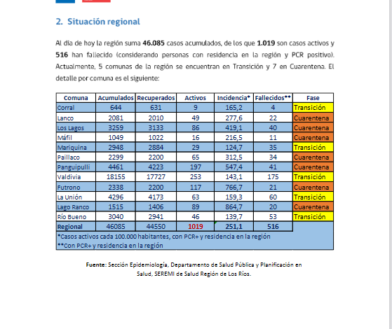 Paillaco , se reportan 20 casos nuevos para Covid-19 , a la fecha los Rios con 516 fallecidos.