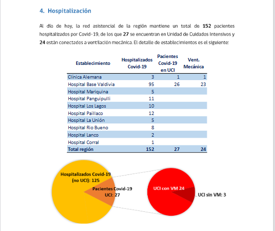 En cuanto a las hospitalizaciones, 152 pacientes se mantienen internados en distintos recintos asistenciales de la región, de los cuales 27 se encuentran en la Unidad de Cuidados Intensivos (UCI) y 24 de ellos, están conectados a ventilación mecánica.
