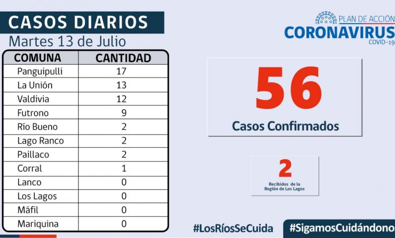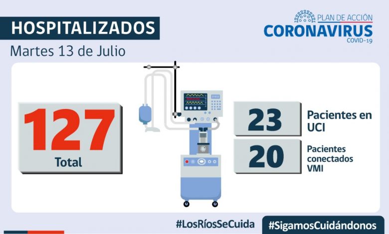 El Seremi de Salud, Keith Hood , informó hoy Martes 13 de Julio 58 nuevos casos de Covid-19, en tanto a la fecha en la region hay 651 casos activos de los cuales 155 corresponden a la comuna de Valdivia y 142 a la comuna de Panguipulli , durante la presente jornada se informa ademas el procesamiento de 776 exámenes , con una positividad de un 6,8% , en la red integrada de los rios se mantienen 127 personas hospitalizadas 20 de ellas , conectadas a un ventilador mecánico. En residencias sanitarias se mantienen 220 usuarios , lo que representa un 71,1% de ocupación de camas. Se informa ademas del lamentable deceso de 6 personas de las comunas de Lago Ranco, Panguipulli, y Valdivia respectivamente.