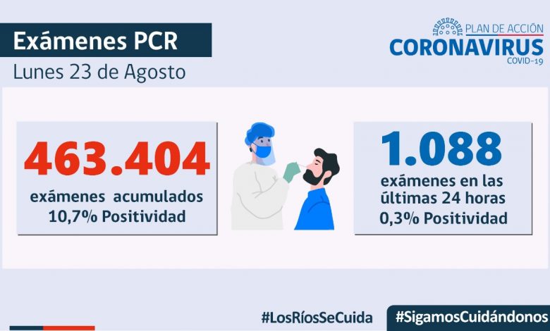 La Red de Laboratorios de Los Ríos procesó en las últimas 24 horas, 1.088 muestras, arrojando un índice diario de positividad de 0,3%. La cantidad total de exámenes PCR realizados en la región asciende a 463.404 con una positividad acumulada de 10,7%.
