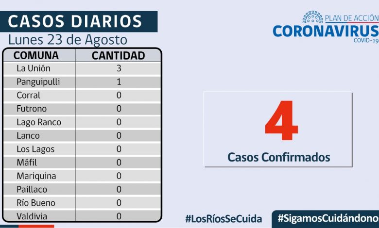 De los 4 casos confirmados por residencia en Los Ríos, 2 corresponden a casos secundarios y 2 sin trazabilidad. En tanto, a la fecha, la región presenta 49.417 casos acumulados, de los cuales 79 corresponden a casos activos, 48.712 a personas recuperadas y 626 a fallecidos.