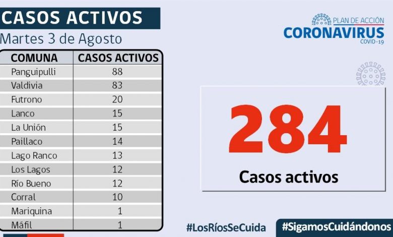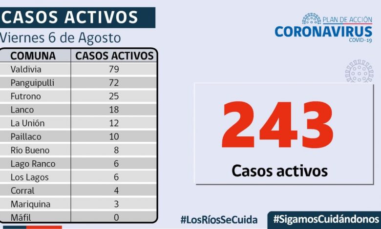 De los 36 casos confirmados por residencia en Los Ríos, 26 corresponden a casos secundarios, 9 aún están sin trazabilidad y 1 se encuentra en investigación. En tanto, a la fecha, la región presenta 49.070 casos acumulados, de los cuales 243 corresponden a casos activos, 48.226 a personas recuperadas y 601 a fallecidos.