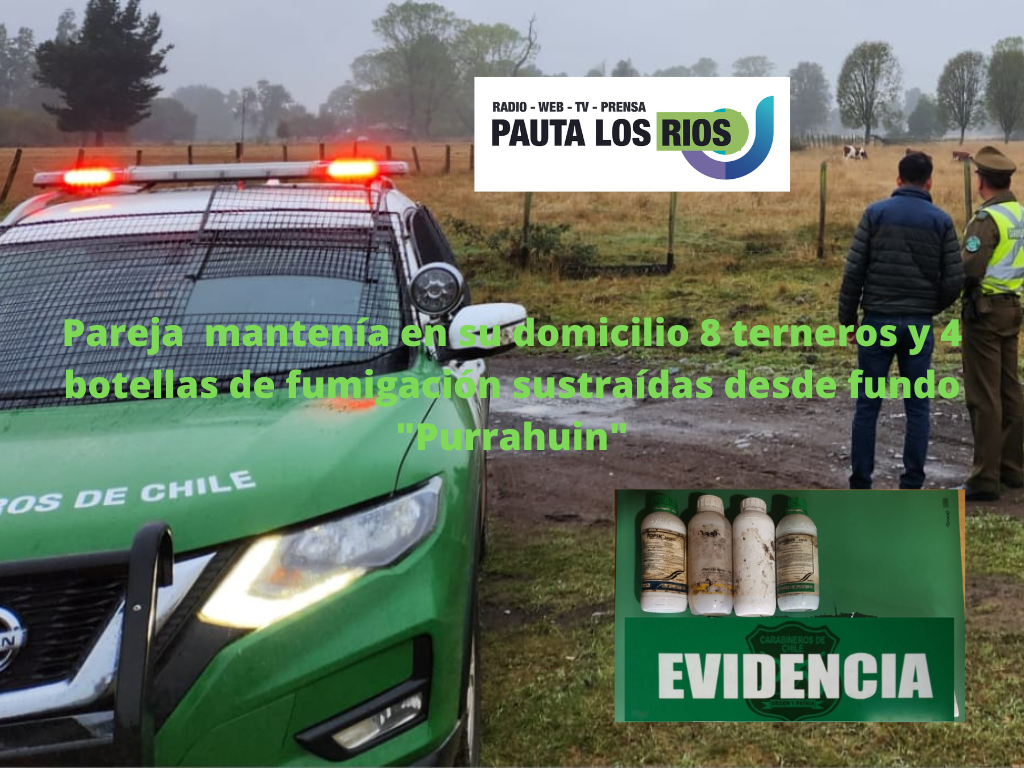 Breves Policial Río Bueno: En sector Contra Trapi de RíoBueno, Carabineros del Retén Diumén detuvieron a pareja que mantenía en su domicilio 8 terneros y 4 botellas de fumigación sustraídas desde fundo «Purrahuin» donde trabajan. Diligencias derivadas de la denuncia del delito permitieron el hallazgo.