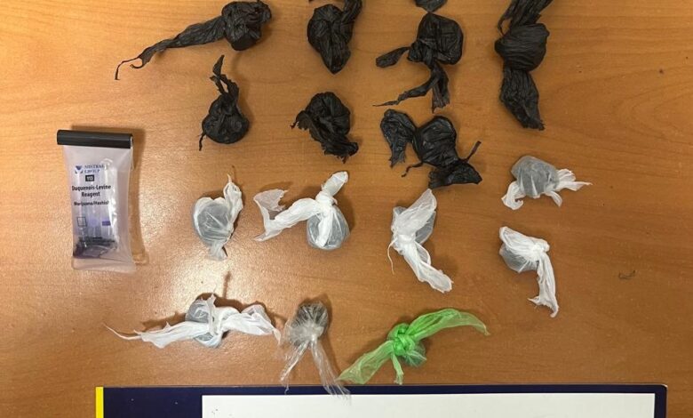 Debido a que uno de ellos no portaba su cédula de identidad, fue trasladado hasta dependencias del Complejo Policial de la PDI, a efecto de corroborar su identidad, razón por la que además se revisaron sus vestimentas, pudiendo observar que portaba un bolso pequeño en cuyo interior se observaron diversas bolsas nylon contenedoras de una sustancia vegetal seca, practicando la respectiva prueba de campo, arrojando la presencia de Cannabis Sativa, razón por la que se procedió a su detención por el delito de Infracción al Artículo 4to de la Ley 20.000. En relación al peso arrojado por la sustancia que portaba, corresponde a 63.96 gramos. Desglosados en 19 envoltorios confeccionados con trozos pequeños de bolsas de nylon de distintos colores, contenedor de una sustancia de origen vegetal seca, color verde, dubitada como Cannabis, con un peso de 20.97 gramos. Y 4 envoltorios confeccionados con trozos de bolsas de nylon de distintos colores, contenedor de una sustancia de origen vegetal seca, color verde, dubitada como Cannabis Sativa, con un peso de 42.99 gramos.