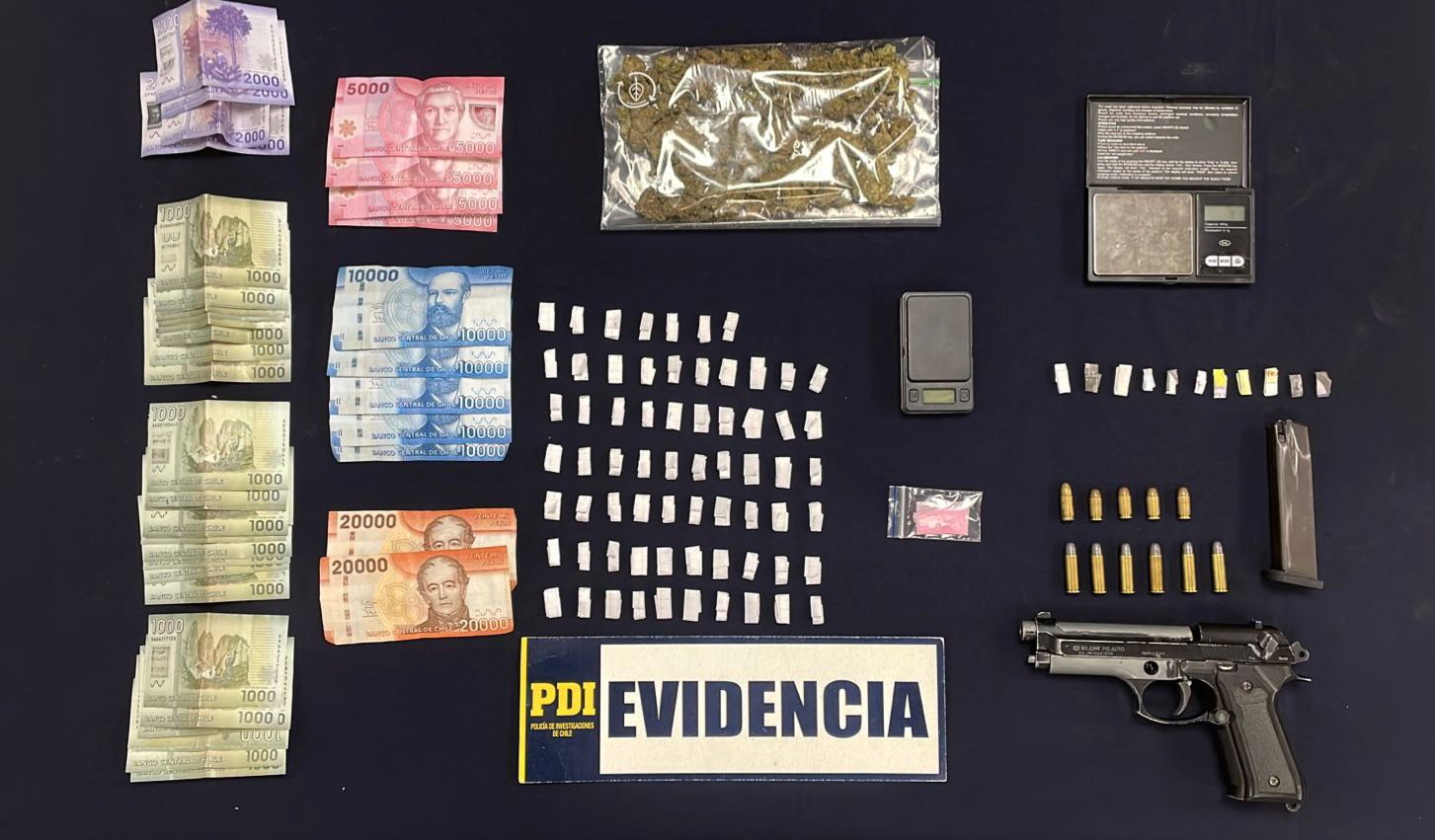En particular, se logró incautar más de 200 dosis de droga entre Cannabis sativa, cocaína base y ketamina, avaluados en cerca de 1 millón de pesos, junto con elementos para su dosificación, dinero en efectivo y 01 arma tipo pistola, de origen fogueo, la cual se encuentra aparentemente modificado encontrándose aparentemente apta para efectuar disparos, junto con 11 municiones de distinto tipo.