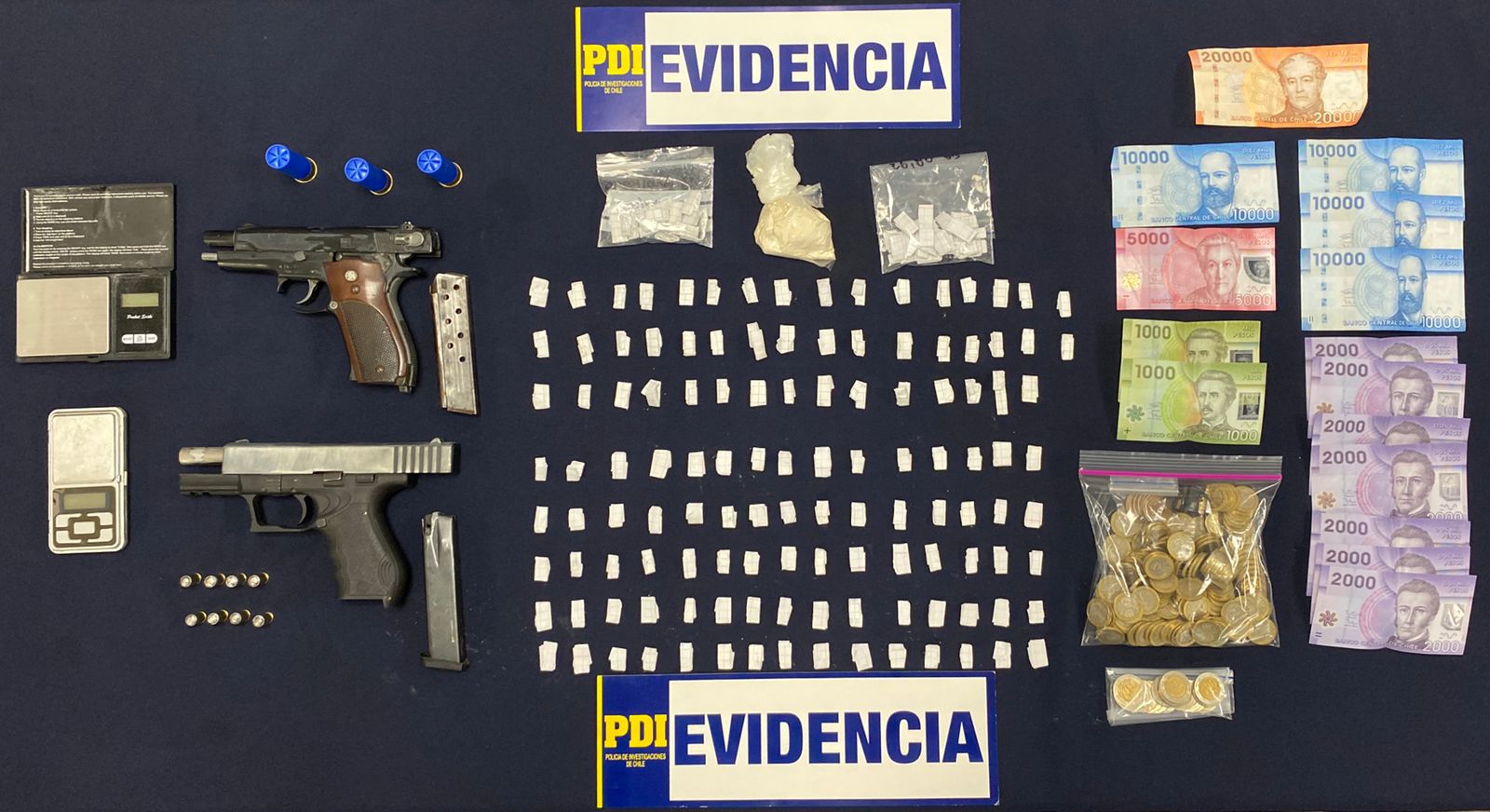 Detectives del Grupo MicroTráfico cero de la Brigada Antinarcóticos y Contra el Crimen Organizado (Brianco) de la PDI Valdivia, de acuerdo a una investigación conjunta con la Fiscalía Local de Valdivia, lograron desarticular la tarde de este jueves, un punto de venta de drogas en Población Pablo Neruda de esta ciudad, deteniendo a un menor de edad de 17 años e incautando cocaína base, dos pistolas a fogueo de las cuales una estaba adaptada para disparar, municiones artesanales, dinero en efectivo y artículos asociados a la venta de droga.