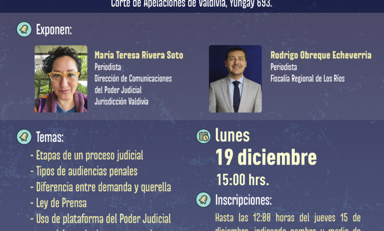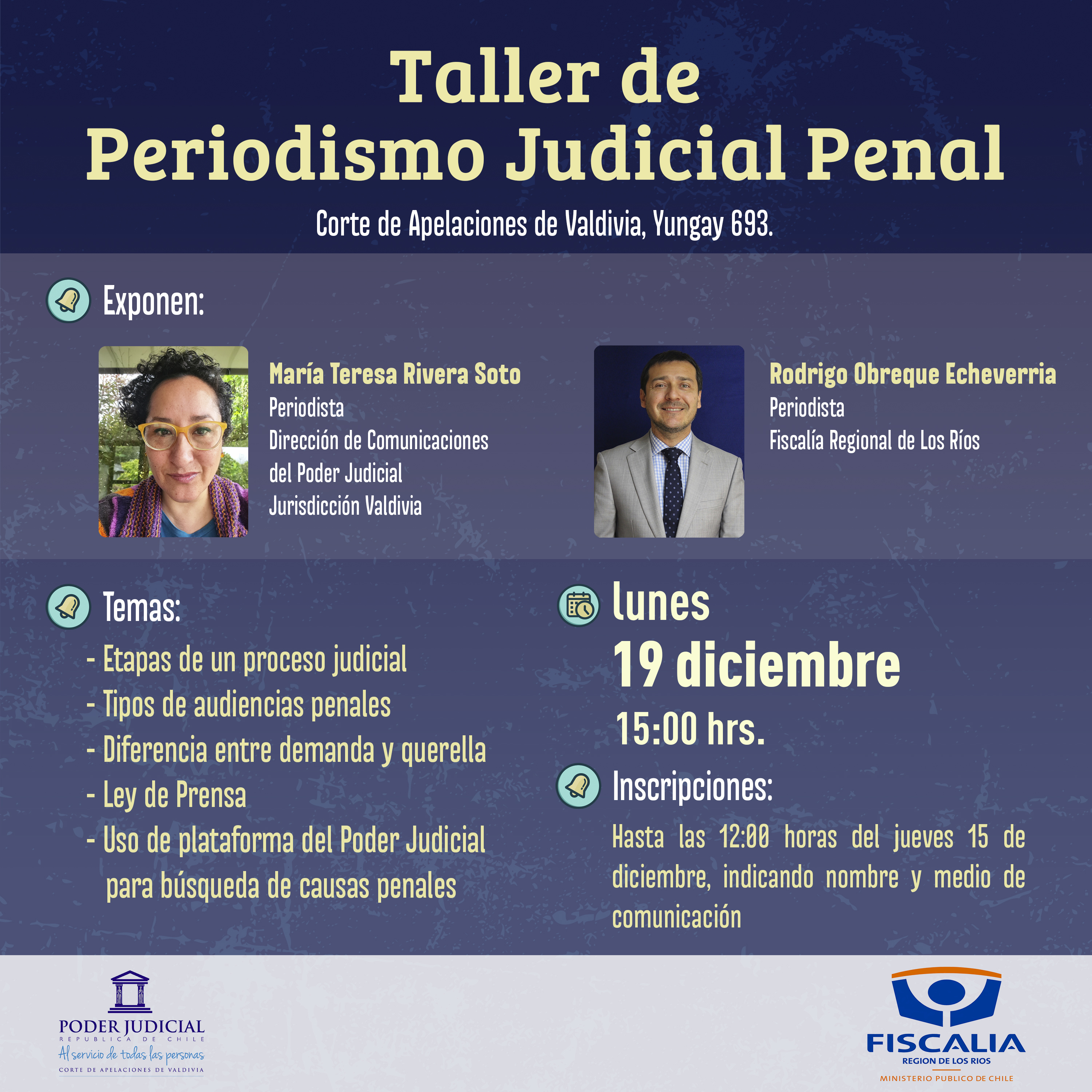 Hasta el próximo 15 de diciembre se encuentran abiertas las inscripciones para participar del taller de Periodismo Judicial Penal, actividad dirigida a comunicadores y profesionales de la comunicación de la región de Los Ríos, la que se realizará de manera presencial el 19 de diciembre, a las 15:00 horas, en la Sala de Pleno del tribunal de alzada valdiviano, ubicado en calle Yungay 693.