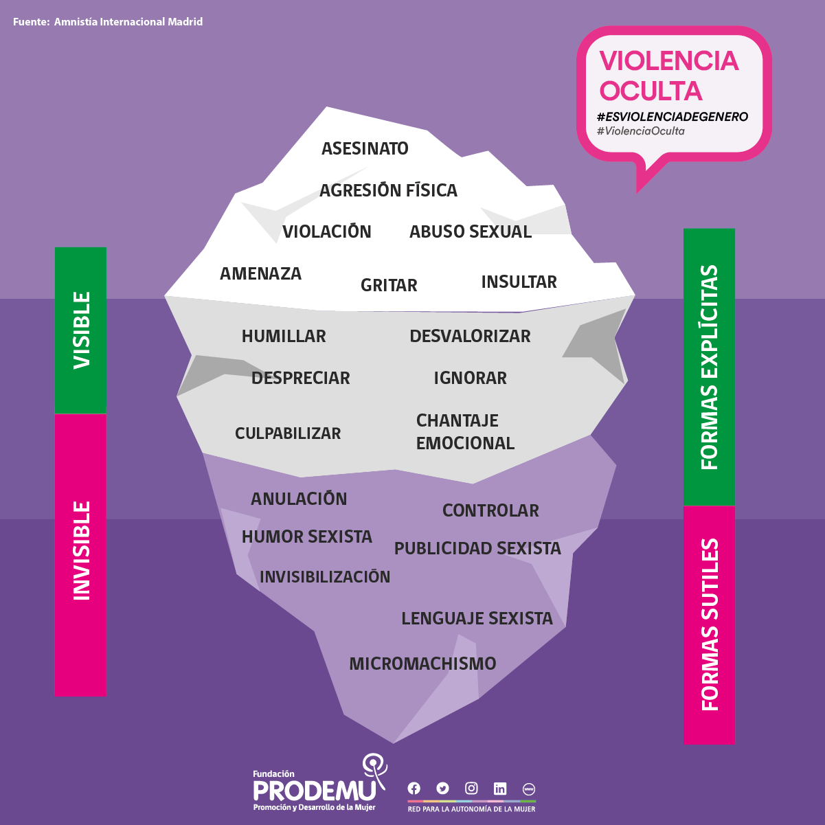 “Para la campaña ‘violencia oculta’ nos quisimos basar en el iceberg de la violencia, realizado por Aministia Internacional, que muestra la violencia en conflictos sociales. Ya que la violencia es como un iceberg; la violencia física es solo una pequeña parte del conflicto. PRODEMU hace un llamado a disminuirla o suprimirla”, explica Paola Diez, Directora Nacional de PRODEMU.