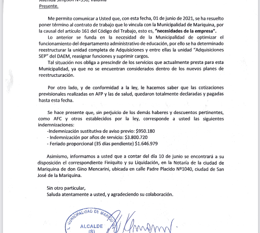 Su intento de poder suscribir y cobrar su finiquito -anunciado por el Alcalde Subrogante en la carta de despido para este día 10 de junio- se vio frustrado por cuanto el notario certificó que de la Municipalidad de Mariquina no se le había remitido dicho documento, cayendo en un incumplimiento legal la corporación edilicia. Respecto a ello, su abogado, Rafael Asenjo Pérez relató a nuestro medio de comunicación las consecuencias judiciales del actuar del empleador y emplazó al actual concejo municipal (como a los futuros concejales electos) para que fiscalicen esta irregularidad y velen por el pago de las indemnizaciones comprometidas.