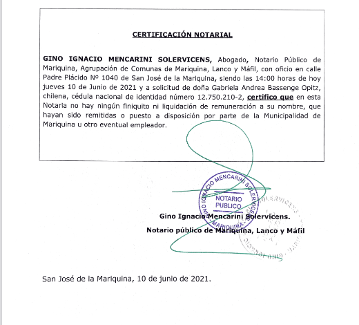 Pasado el mediodía de este 10 de junio, la constructor civil Gabriela Andrea Bassenge Opitz procedió a concurrir a dependencias de la Notaría de Mariquina, con el propósito de suscribir su finiquito de trabajo y última liquidación de remuneraciones, luego que el jueves de la semana pasada el Alcalde Subrogante de Mariquina le notificara su desvinculación del departamento de Educación del municipio sanjosino (lugar donde se desempeñaba como Inspector Técnico de Obtras desde inicios del 2017).