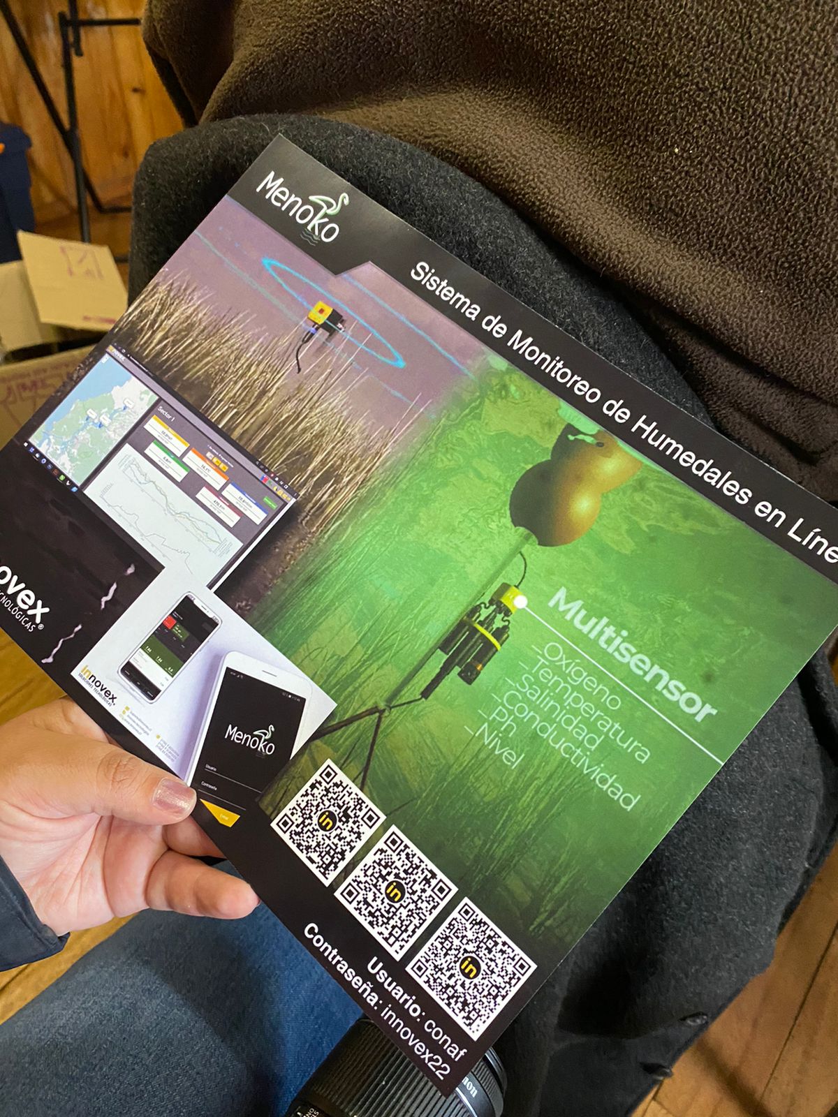 Menoko, nombre del prototipo desarrollado por la empresa de tecnología INNOVEX (https://www.innovex.cl/), es un sistema de monitoreo de variables fisicoquímicas, orientado principalmente para la conservación y estudios de los humedales. Este sistema está compuesto por un módulo de monitoreo y transmisión que se conecta a sensores que se utilizan para medir variables del agua, como son pH, oxígeno, temperatura, conductividad, nivel de columna de agua. La modularidad del sistema permite integrar una gran cantidad de sensores y su versatilidad, considera la conexión a diferentes tipos de módulos de transmisión, como GPRS (General Packet Radio Service) y también satelital, brindando la posibilidad de entregar información en línea de las variables monitoreadas en los humedales, junto con la posibilidad de analizar la información mediante aplicaciones web y App para celulares.
