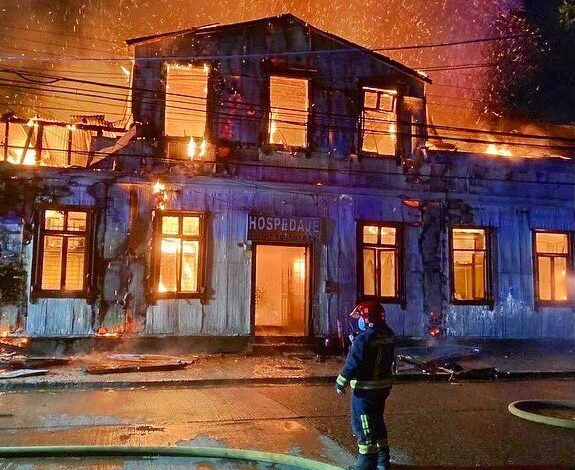 Quince personas damnificadas y una lesionada atendida en el Hospital base de Valdivia deja voraz incendio en un Hospedaje