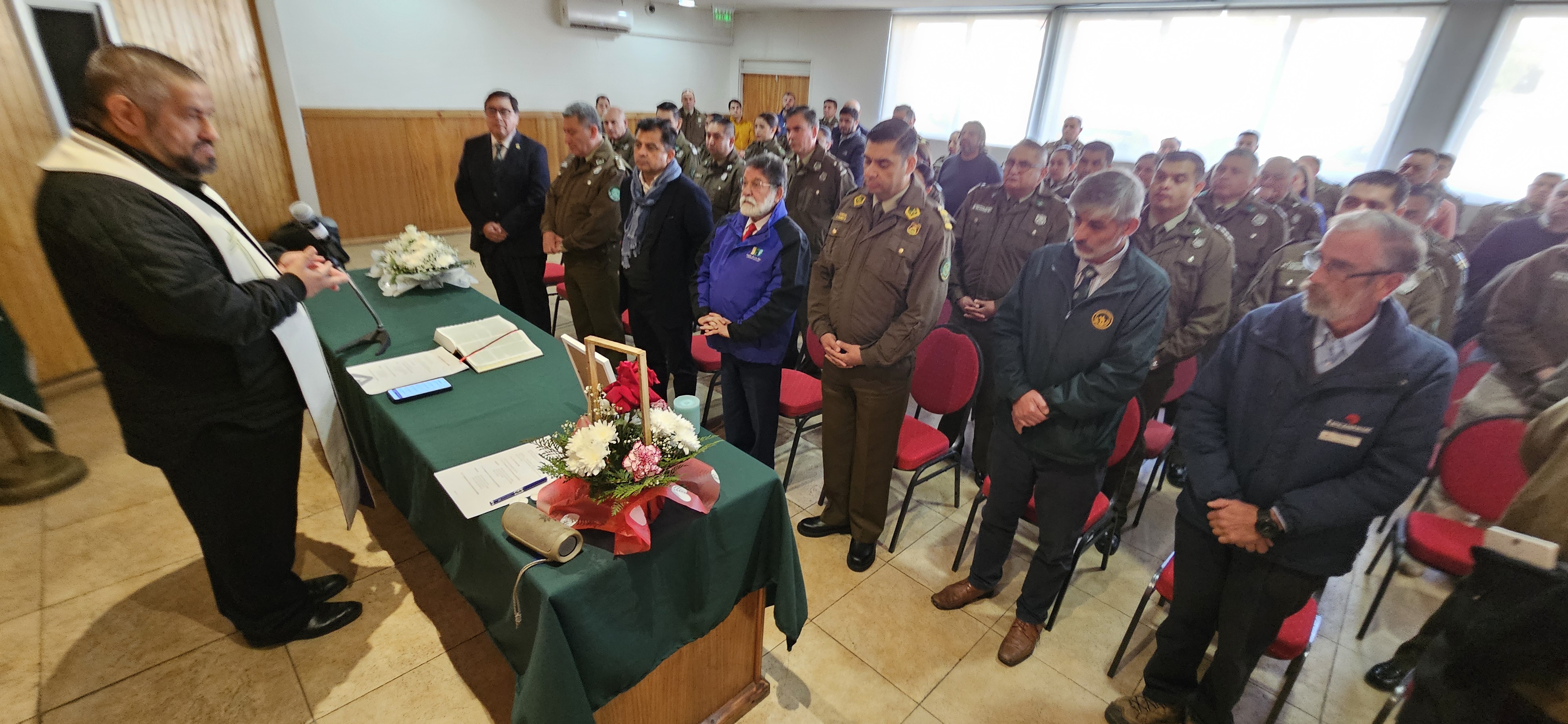 El Capellán institucional, Presbítero Mauricio Meza Inostroza ofició el acto litúrgico, donde reflexionó sobre el compromiso incondicional de servició público del Teniente Emmanuel Sánchez (Q.E.P.D.), pidiendo por su eterno descanso, por el consuelo familiar y el de todos los Carabineros.