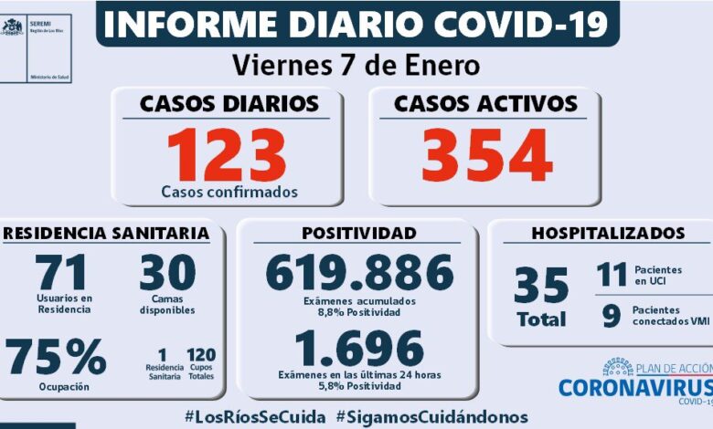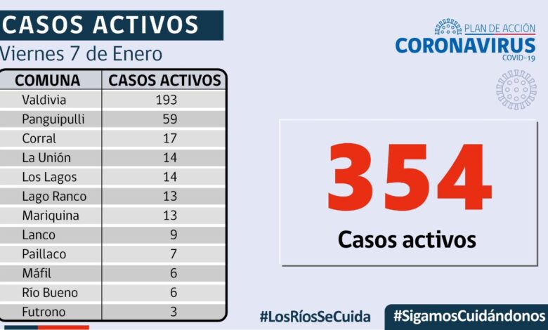 A la fecha, hay 354 casos activos, de los cuales 193 corresponden a la comuna de Valdivia y 59 a la comuna de Panguipulli, La Secretaría Regional Ministerial de Salud notificó 123 exámenes positivos para SARS-CoV-2 recibidos desde la Red de Laboratorios de Los Ríos.