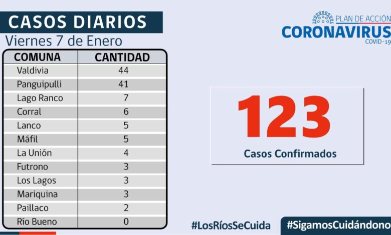 De los 123 casos confirmados por residencia en Los Ríos, 102 corresponden a casos secundarios, 14 aún están sin trazabilidad, 5 están en investigación y 2 casos son importados. En tanto, a la fecha, la región presenta 54.720 casos acumulados, de los cuales 354 corresponden a casos activos, 53.677 a personas recuperadas y 689 a fallecidos.