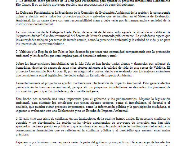 La denuncia sobre presiones de la Delegada Presidencial para aprobar el proyecto inmobiliario Condominio Río Cruces II es un hecho grave que requiere una respuesta seria de parte del gobierno.