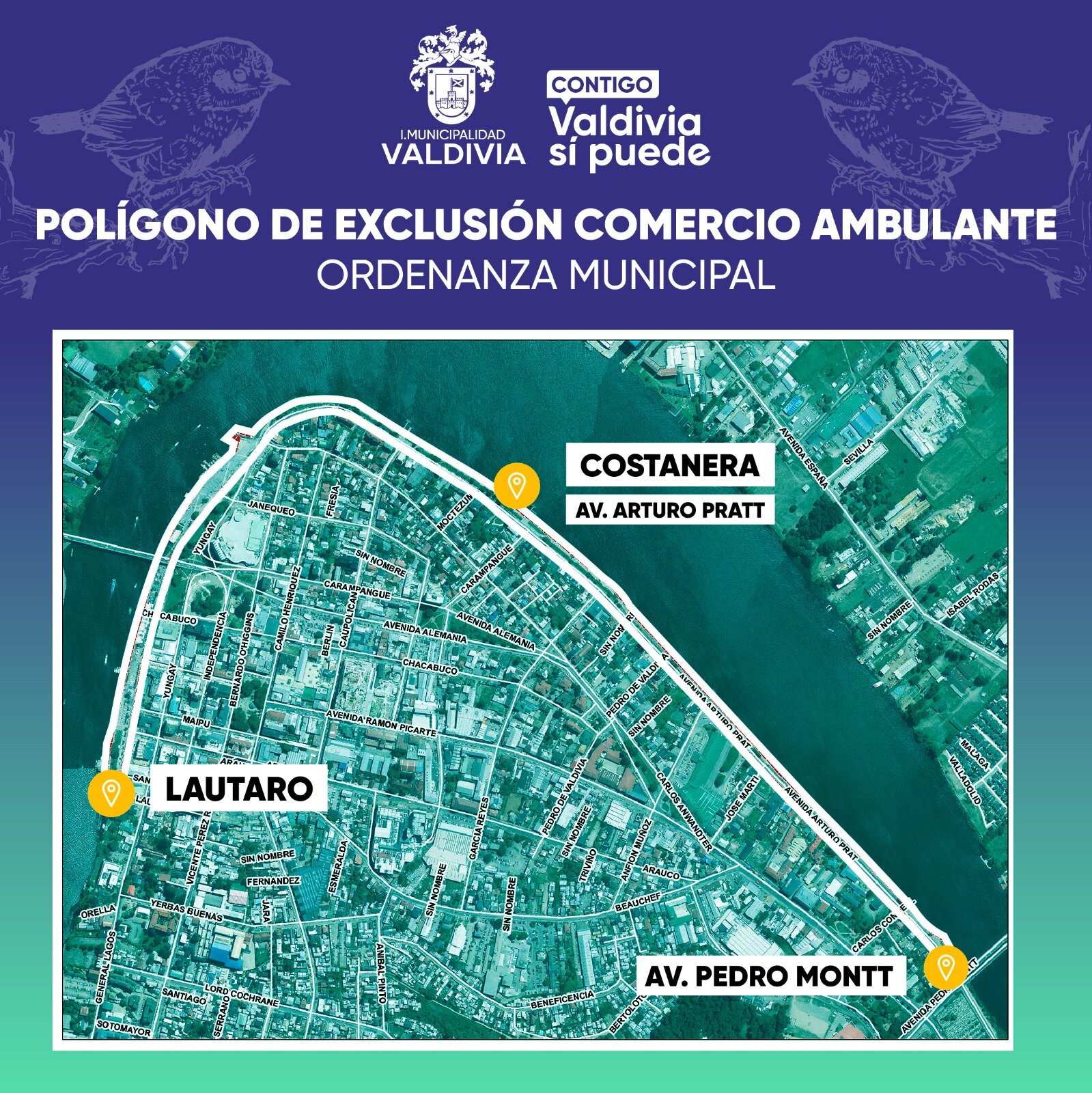 La Ilustre Municipalidad de Valdivia nuevamente dio a conocer las medidas para ordenar el comercio ambulante en la comuna, que incluyen la restricción de esta práctica en calles céntricas de la capital regional, estableciendo un polígono de exclusión.