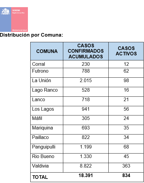 - 1 casos en la comuna de Lago Ranco, correspondientes a un hombre de 63 años. Este caso, aún está sin trazabilidad.