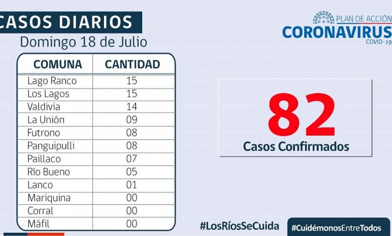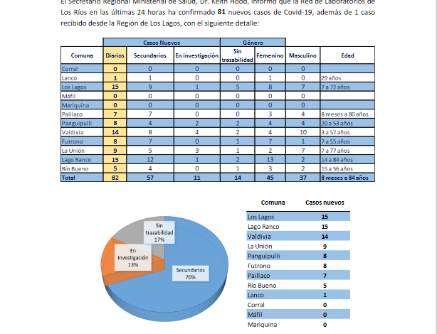 La Secretaría Regional Ministerial de Salud notificó 81 exámenes positivos para SARS-CoV-2 recibidos desde la Red de Laboratorios de Los Ríos. Adicionalmente, se recibió un caso desde la región de Los Lagos. Es así que el total regional de casos nuevos en Los Ríos es de 82.