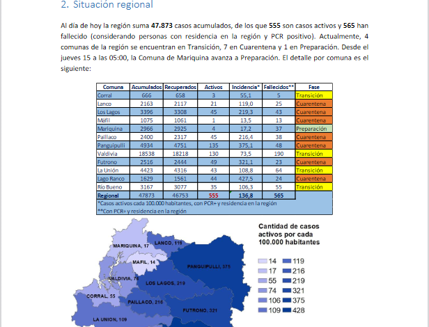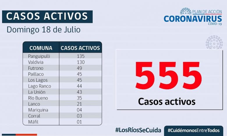 De los 82 casos confirmados por residencia en Los Ríos, 57 corresponden a casos secundarios, 14 aún están sin trazabilidad y 11 se encuentran en investigación. En tanto, a la fecha, la región presenta 47.873 casos acumulados, de los cuales 555 corresponden a casos activos, 46.753 a personas recuperadas y 565 a fallecidos.