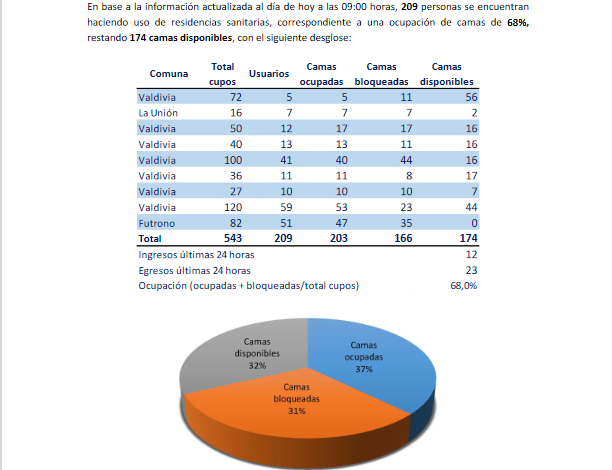 Respecto a las Residencias Sanitarias, a la fecha, 209 personas están haciendo uso de estos espacios de aislamiento, lo que representa un porcentaje de 68% de camas ocupadas. Al día de hoy, quedan 174 camas disponibles en estos espacios de aislamiento.