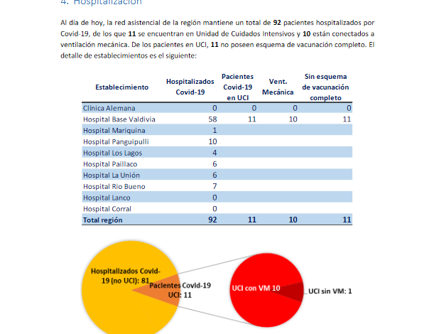 En cuanto a las hospitalizaciones, 92 pacientes se mantienen internados en distintos recintos asistenciales de la región, de los cuales 11 se encuentran en la Unidad de Cuidados Intensivos (UCI) y 10 de ellos, están conectados a ventilación mecánica. De los pacientes que se encuentran en UCI, 11 de ellos, no tienen su esquema de vacunación completa.
