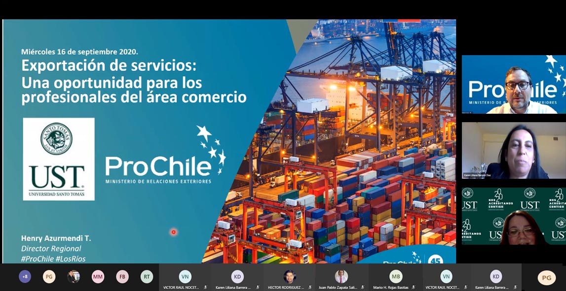 La actividad, se realizó a través de la Facultad de Economía y Negocios Ingeniería Comercial de la Universidad Santo Tomás, y ProChile Los Ríos, con el tema “Exportación de Servicios: Una oportunidad para los profesionales del área comercio” a través de la plataforma Teams.