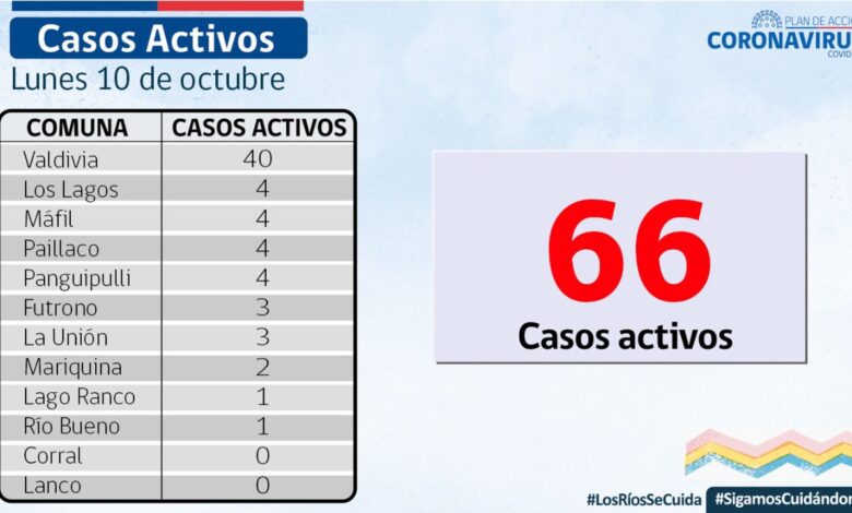 A la fecha, hay 66 casos activos, de los cuales 40 corresponden a la comuna de Valdivia y 4 a las comunas de Los Lagos