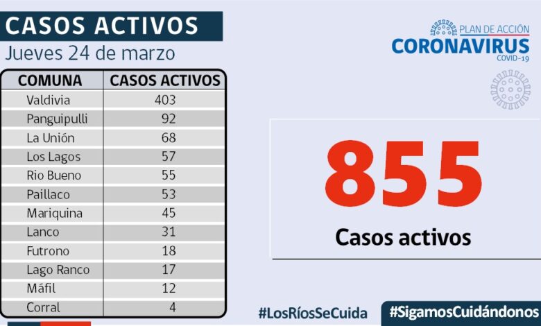 A la fecha, hay 855 casos activos, de los cuales 403 corresponden a la comuna de Valdivia y 92 a la comuna de Panguipulli.