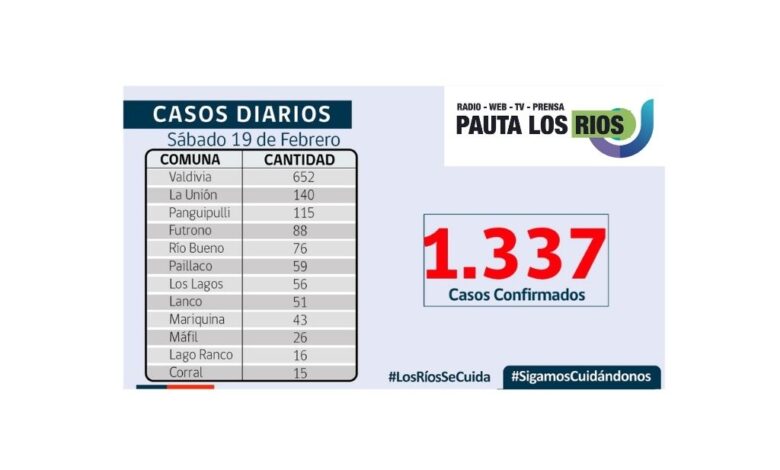 Se reportan 1.337 nuevos contagios en los Ríos, en tanto la positividad alcanza al 38,98%