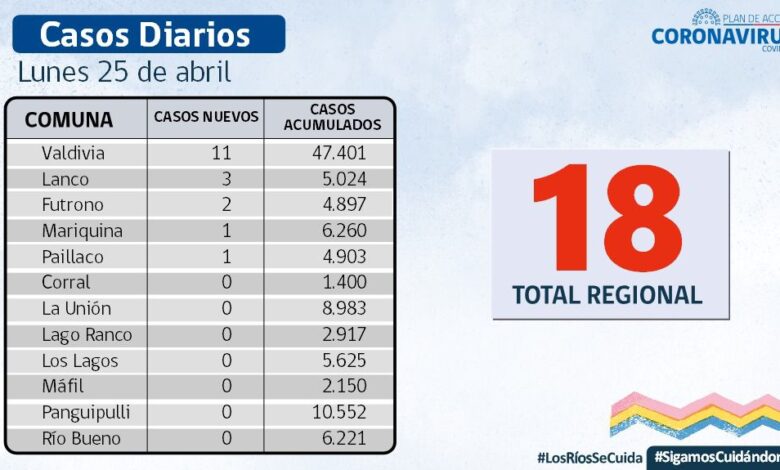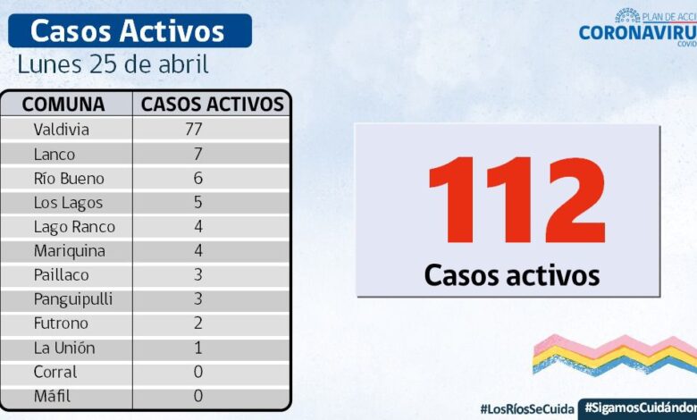 A la fecha, hay 112 casos activos, de los cuales 77 corresponden a la comuna de Valdivia y 7 a la comuna de Lanco.