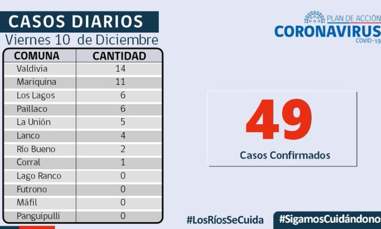 El SEREMI de Salud(S), Leonardo Bórquez, informó que hoy se reportaron 49 nuevos casos de COVID-19 en Los Ríos,a la fecha en Los Ríos hay 382 casos activos, de los cuales 184 corresponden a la comuna de Valdivia y 42 a la comuna de Río Bueno,durante esta jornada se informó el procesamiento de 979 exámenes, con una positividad de 3,6% ,hoy en la Red Integrada de Los Ríos se mantienen 39 personas hospitalizadas, 8 de ellas, conectadas a un ventilador mecánico.En Residencias Sanitarias se mantienen 77 usuarios, lo que representa un 79,2% de ocupación de camas.