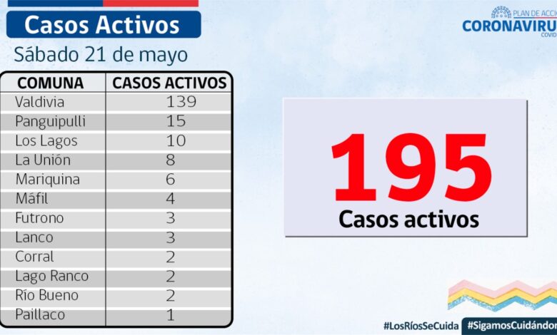 A la fecha, hay 195 casos activos, de los cuales 139 corresponden a la comuna de Valdivia y 15 a la comuna de Panguipulli.