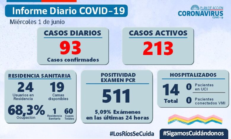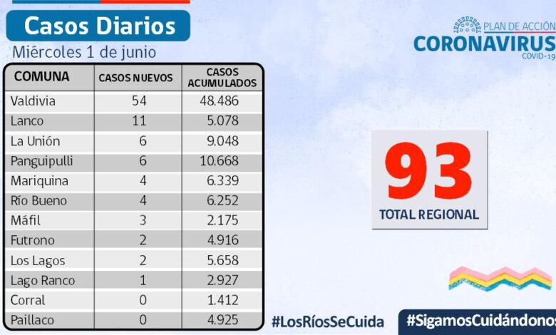 La Secretaría Regional Ministerial de Salud Los Ríos informó que 93 exámenes resultaron positivos para SARS-CoV-2. Del total de casos, 27 se diagnosticaron mediante test PCR y 66 fueron pesquisados con test de antígeno.