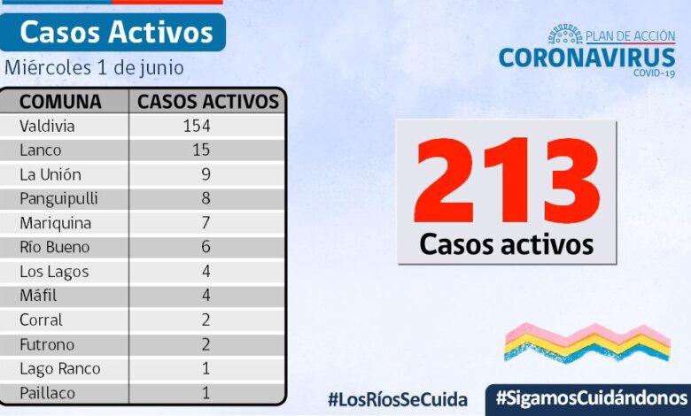 A la fecha, hay 213 casos activos, de los cuales 154 corresponden a la comuna de Valdivia y 15 a la comuna de Lanco.