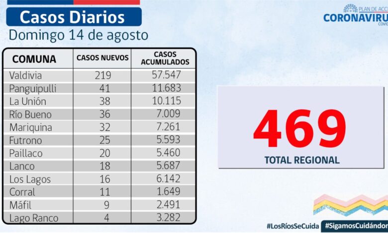 Se reportaron 469 contagios nuevos en los Ríos y 1.970 casos activos de los cuales 889 corresponden a Valdivia