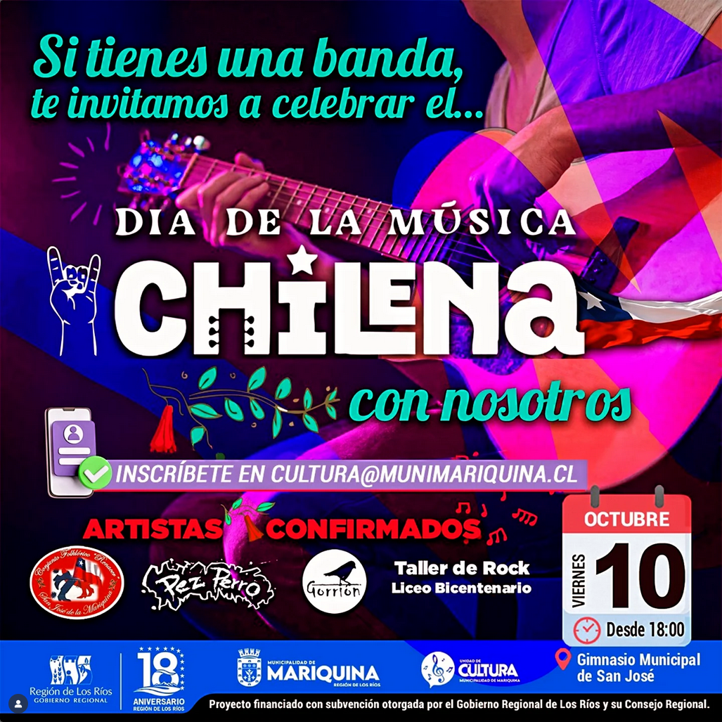 🎶🎸Nos juntamos a celebrar con todo en el Gimnasio Municipal de Mariquina, con música en vivo, talento local y pura energía  desde las 18:00 hrs, NO FALTES ‼️