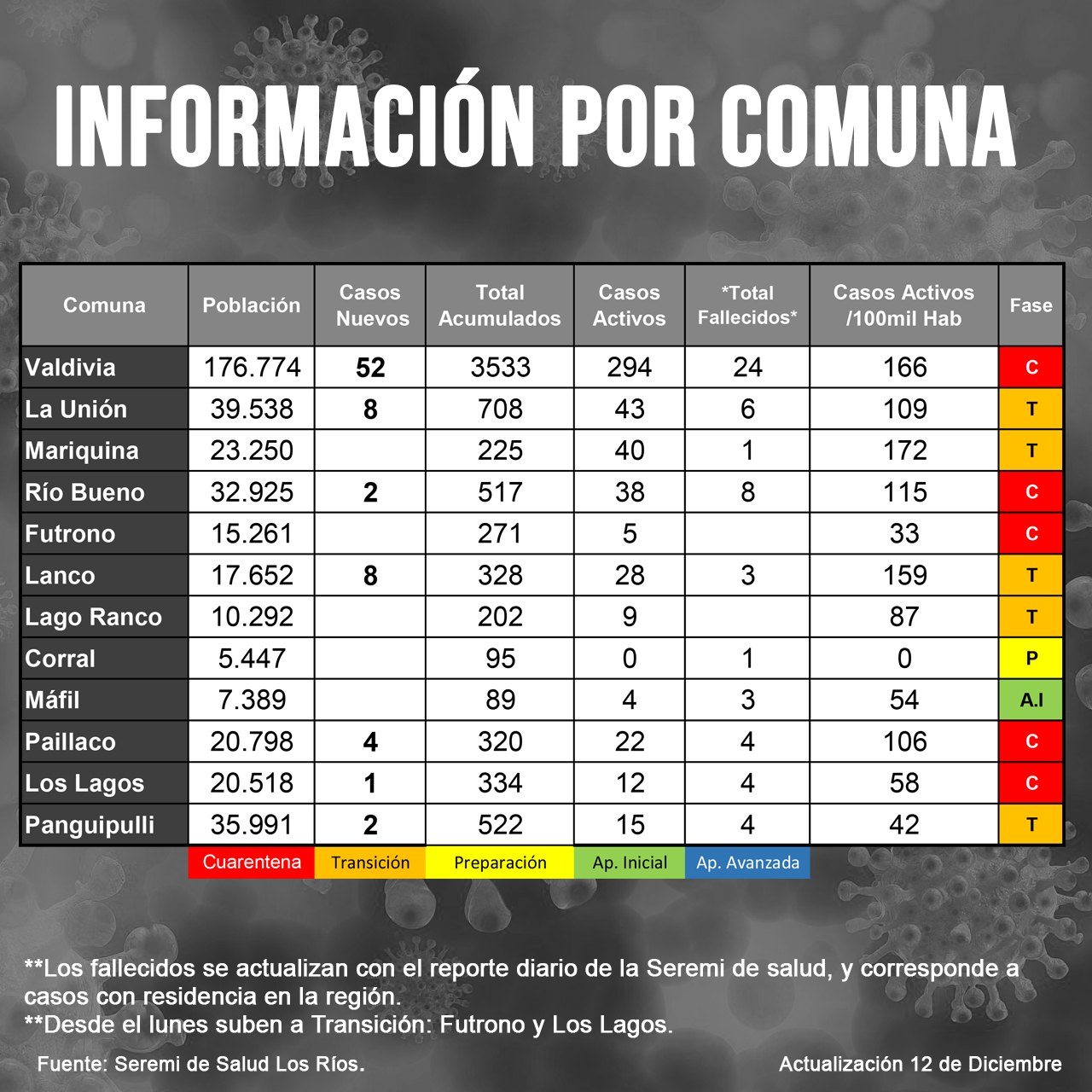 La Secretaria Regional Ministerial de Salud, Dra. Regina Barra, informó que, en las últimas 24 horas, la Red de Laboratorios de Los Ríos ha confirmado 78 nuevos casos de Covid-19 mediante examen PCR. El detalle es el siguiente: