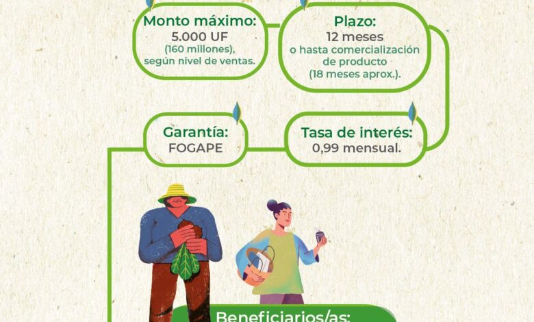 Cuenta con una tasa preferencial del 0,99% y no requiere garantía hipotecaria, ya que cuenta con aval del Estado. Cubre un monto máximo de 5.000 UF y el plazo de pago es de hasta 12 meses o hasta la comercialización del producto, con un tope de 18 meses.