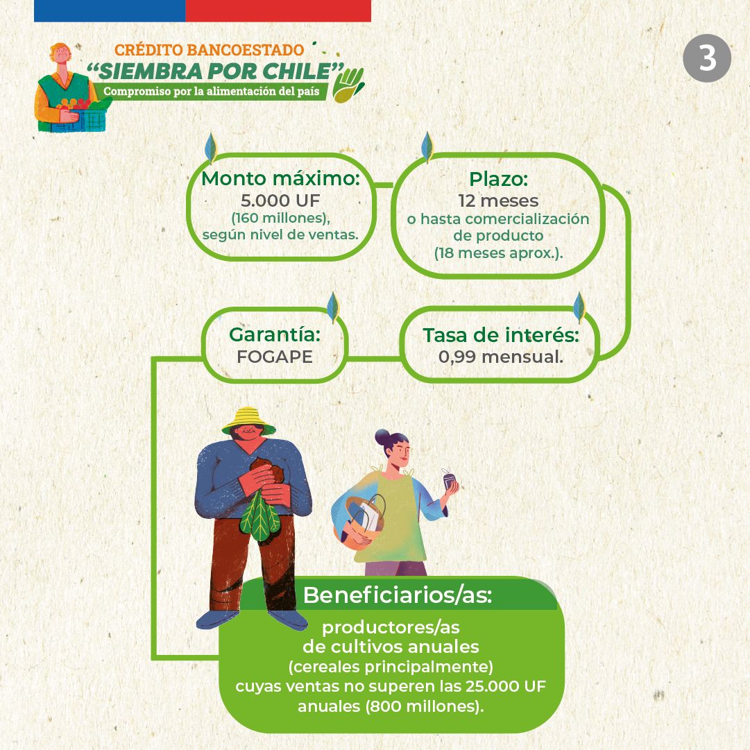 El crédito “Siembra por Chile”, está destinado a productores agrícolas cuyas ventas anuales no superen las 25.000 UF. Además, deben contar con al menos un año de experiencia en el rubro.