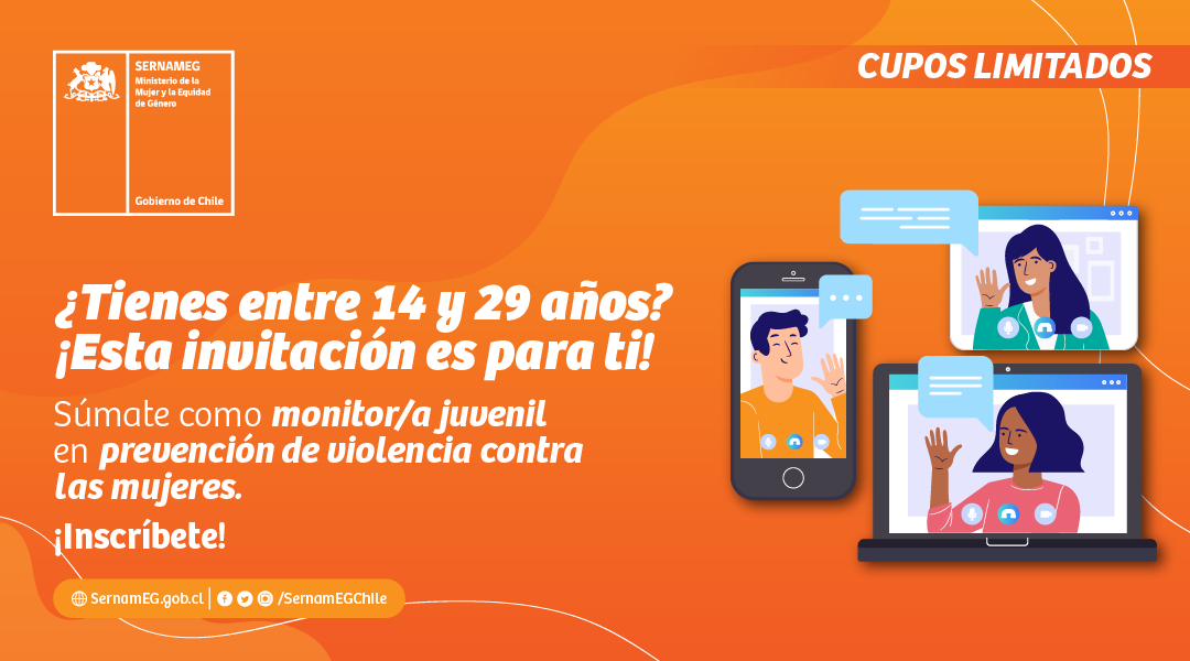 El Servicio Nacional de la Mujer y la Equidad de Género, ha iniciado el proceso de inscripción para ser parte de los talleres que realizará el Programa de Prevención de Violencia contra las Mujeres (VCM) en nuestra región, a través de la página de nuestro servicio www.sernameg.gob.cl. El programa implementará talleres de Sensibilización y Capacitación por videoconferencia y estarán dirigidos a jóvenes entre 14 a 29 años de edad. Por otra parte se invita a participar en capacitación como Monitoras y Monitores Juveniles en Prevención de la Violencia contra las Mujeres y a Agentes Preventivos de Violencia contra las Mujeres. Actividades dirigidas principalmente a interesad@s pertenecientes a las comunas de Valdivia, Paillaco y La Unión.