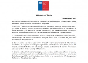 DECLARACIÓN PÚBLICA Los Ríos, marzo 2021 En relación al fallecimiento de un usuario en su domicilio, ocurrido ayer jueves 11 de marzo en la ciudad de Valdivia, el Servicio de Salud Valdivia declaralo siguiente:1.-En cuanto a la denuncia recibida en torno a llamadas realizadas al número de emergencia del SAMU,y al recinto de Atención Primaria del territorio, se informa que se han solicitado los antecedentes alCentro Regulador y se instruirá un sumario administrativo, que permita determinar las acciones realizadas por los equiposinvolucradosy establecer las eventuales sanciones, si correspondieran.2.-En relación a la denuncia sobre el llamado realizado a un equipo de salud de las Residencias Sanitarias, informamos que esta materia será abordada e investigada por la Seremi de Salud Los Ríos, institución que administra dichos dispositivos.3.-Cabe mencionar que,una vez que el Servicio de Salud fue informado del fallecimiento del usuario, se coordinócon los equiposinvolucradospara responder con prontitud ante la solicitud de la emisión del respectivo certificado de defunción, actividad que realizó el establecimiento de AtenciónPrimaria que atiende el territorio donde se produjo el fallecimiento.4.-El Servicio de Salud Valdivia lamenta este gravehecho y envía sus condolencias a la familia del usuario, e informa que ha solicitado a la Seremi de Salud Los Ríosuna reunión de coordinación,en conjunto con las instituciones policiales, con la finalidad de revisar e insistir en los procedimientosdefinidos, para que hechos como el suscitado no se repitan.
