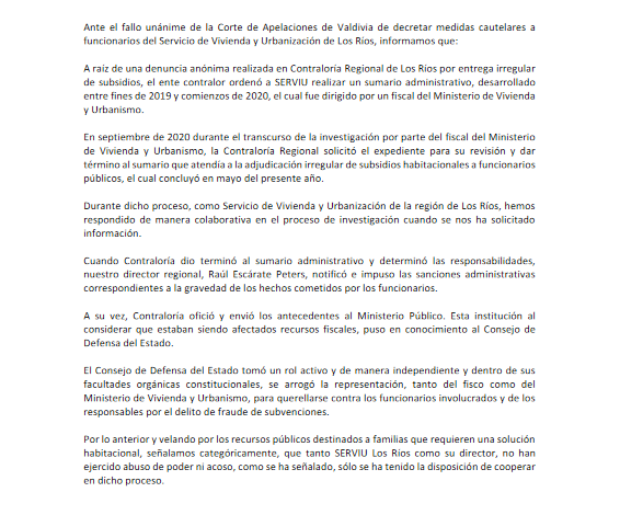 Declaración publica del SERVIU. La autoridad aclaró que el subsidio no se ha materializado y que el sumario debiera concluir la próxima semana.