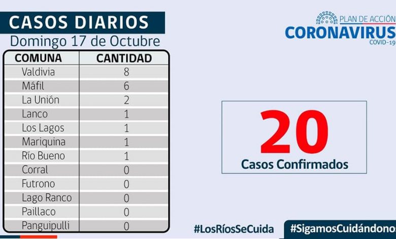 El SEREMI de Salud, Keith Hood, informó que hoy se reportaron 20 nuevo caso de COVID-19 en Los Ríos, Durante esta jornada se informó el procesamiento de 1.219 exámenes, lo que representa un índice diario de positividad 1,4%,En Residencias Sanitarias se mantienen 43 usuarios, lo que representa un 50% de ocupación real.A la fecha en Los Ríos hay 83 casos activos, de los cuales 40 corresponden a la comuna de Valdivia y 14 a la comuna de La Unión .
